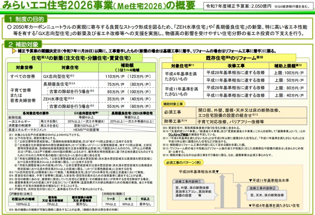 そんな方に知っていただきたいのが、国がスタートさせた**『みらいエコ住宅2026事業 補助金』です。
