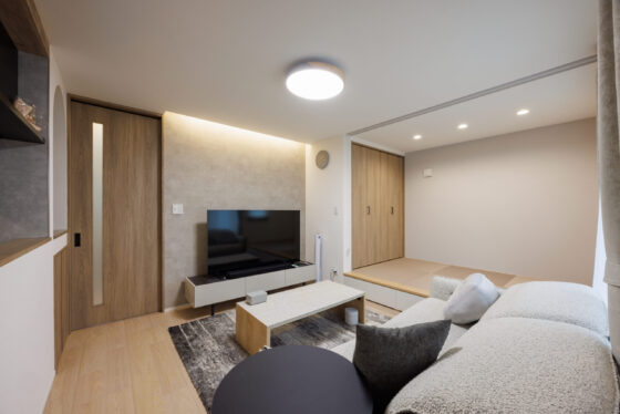 リビングのインテリアに合わせたナチュラルな色合いの畳コーナー。