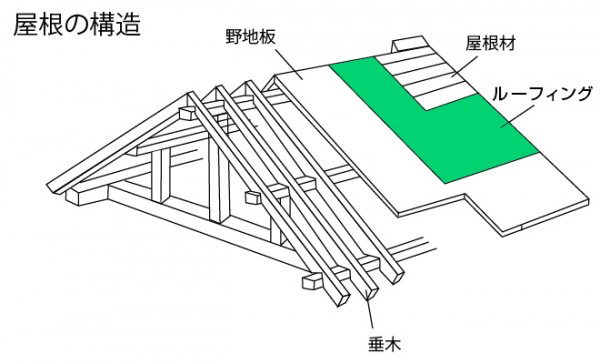 野地板(のじいた):垂木に乗っている、ルーフィングと屋根材を支える土台となる板。