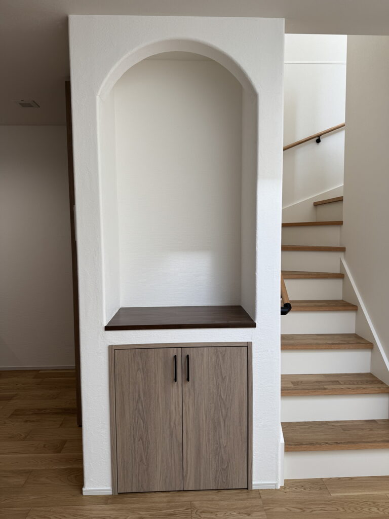 写真のR垂れ壁はしっくい仕上げで施工しています。