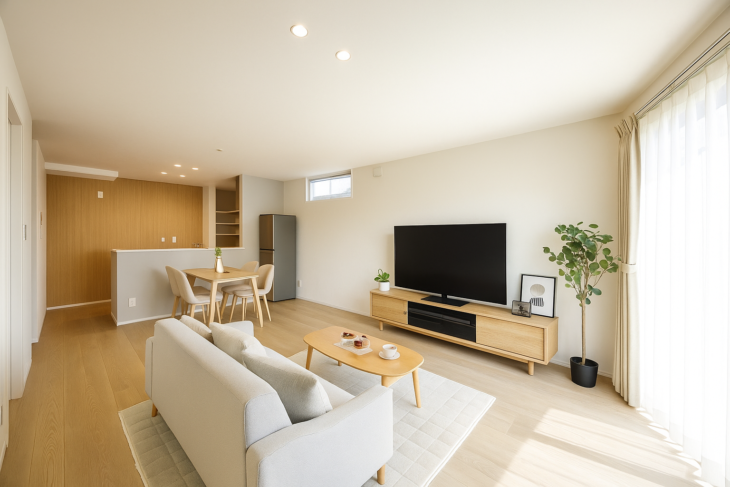 - キッチンから家族を見渡せる一直線LDK
