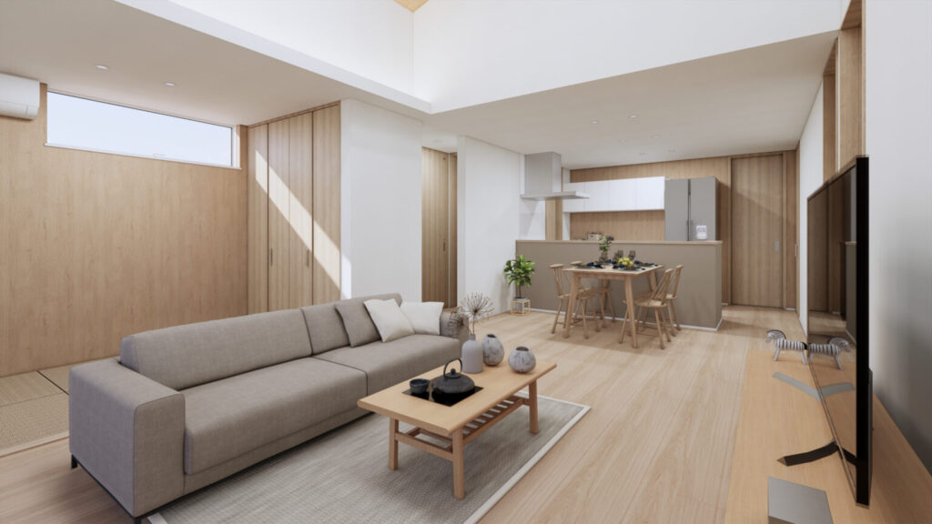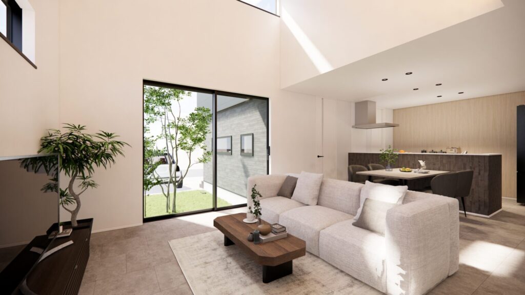 - 開放的な吹き抜けのあるホテルライクなリビング