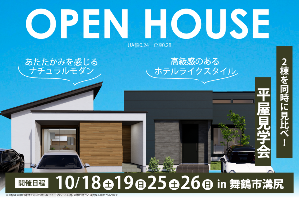 - 【 完成見学会 】10/18~2週連続開催!2棟を同時に見比べ!平屋見学会(舞鶴市溝尻)