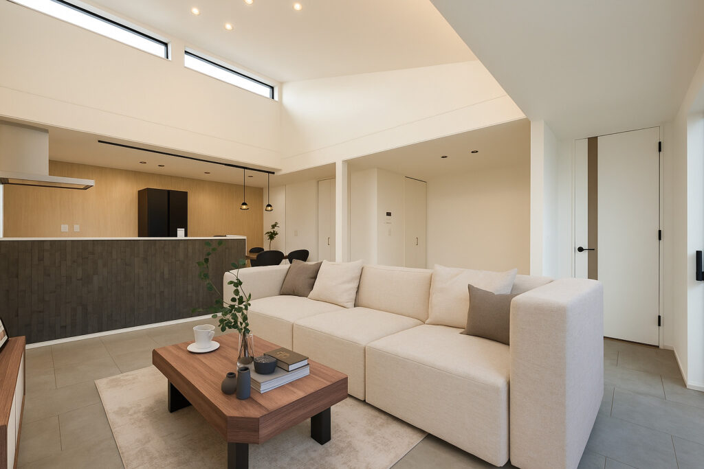 吹き抜けの光が心地よい、開放感と上質さを兼ね備えたリビング