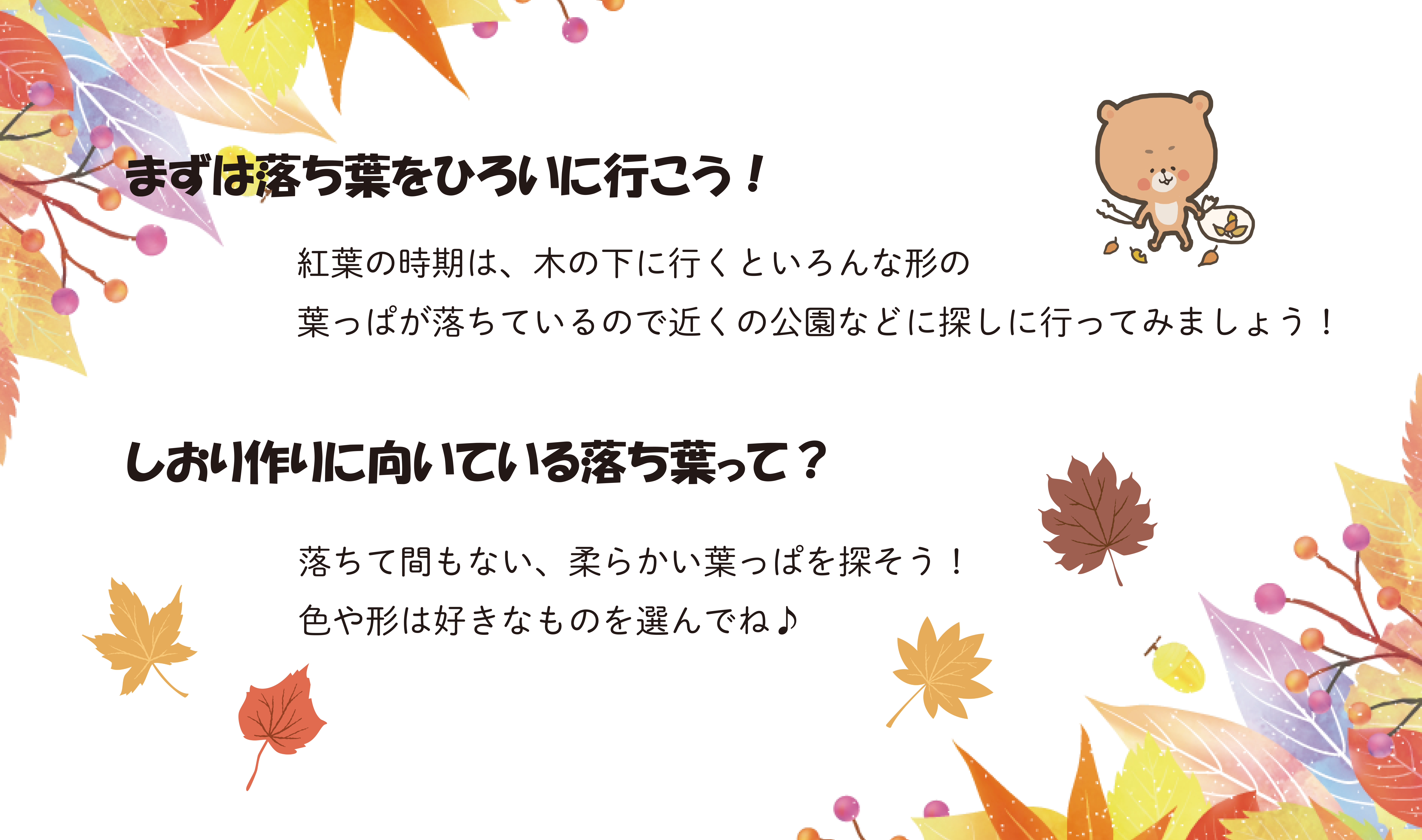 落葉して時間が経っているものは、葉っぱの水分がぬけてしまいぱりぱりで、今回のしおりづくりには少し不向きです💦