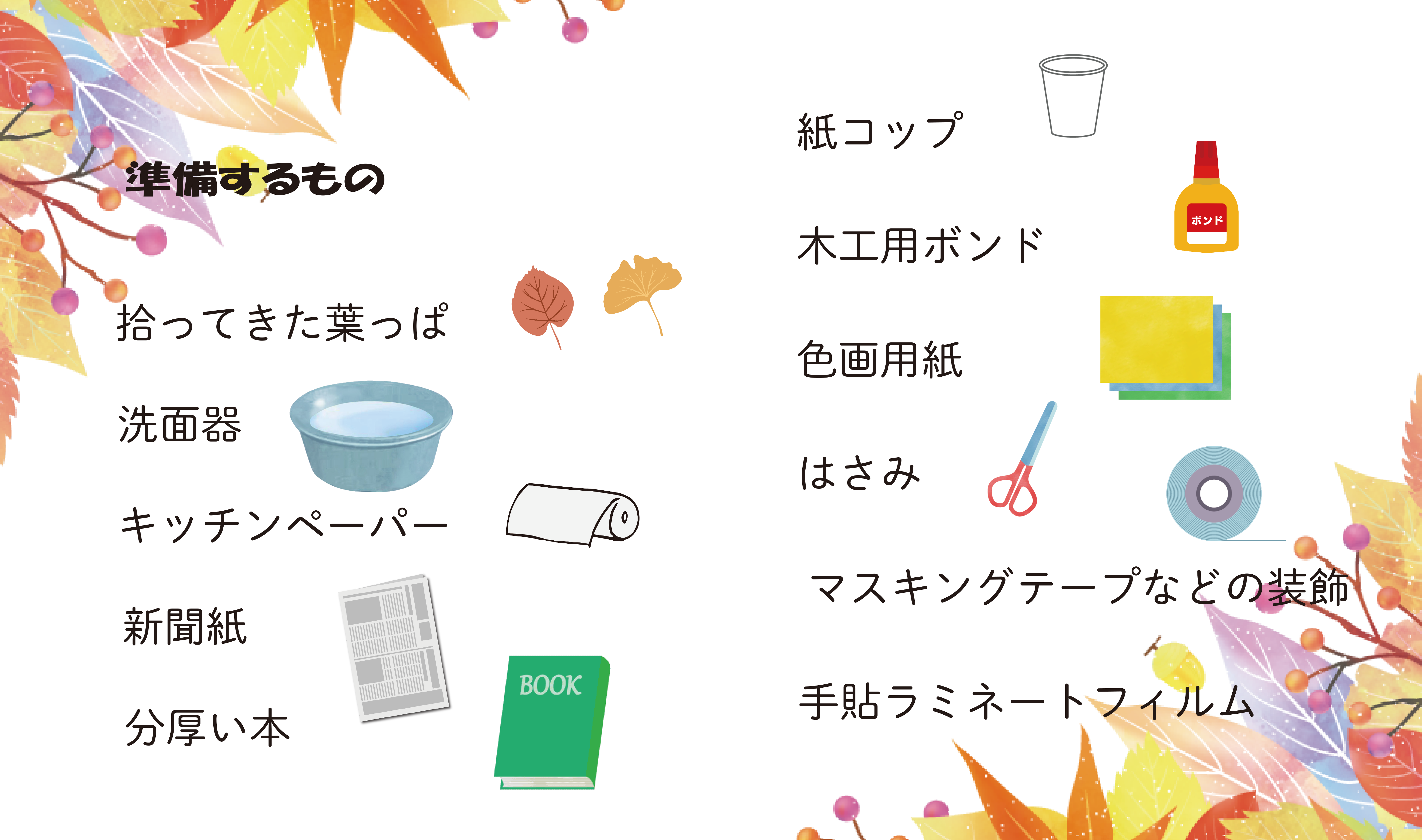 今回準備する材料は、しおり用の素材というより、作る過程で必要な道具の方が多いですね。