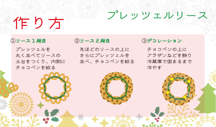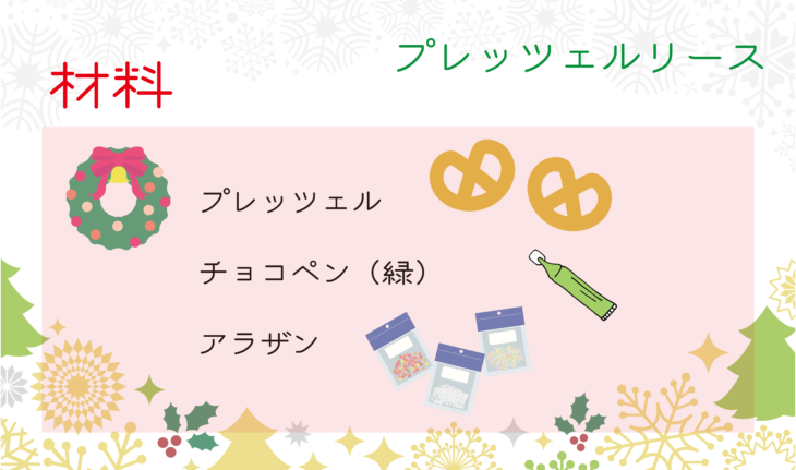 次に紹介するのは、プレッツェルとチョコペンで作れるクリスマスリースです!