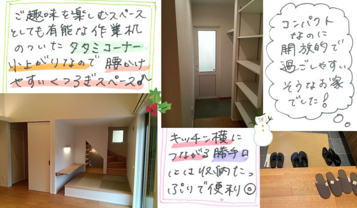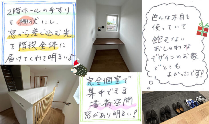 見学会に来てくださったお客様からは「色んな木目を使っていて飽きないおしゃれなデザインのお家で良かったです!」「書斎が欲しいと思っていたので実際のサイズ感や造作の机など見れてとても勉強になりました!」とのお声をいただいています♪