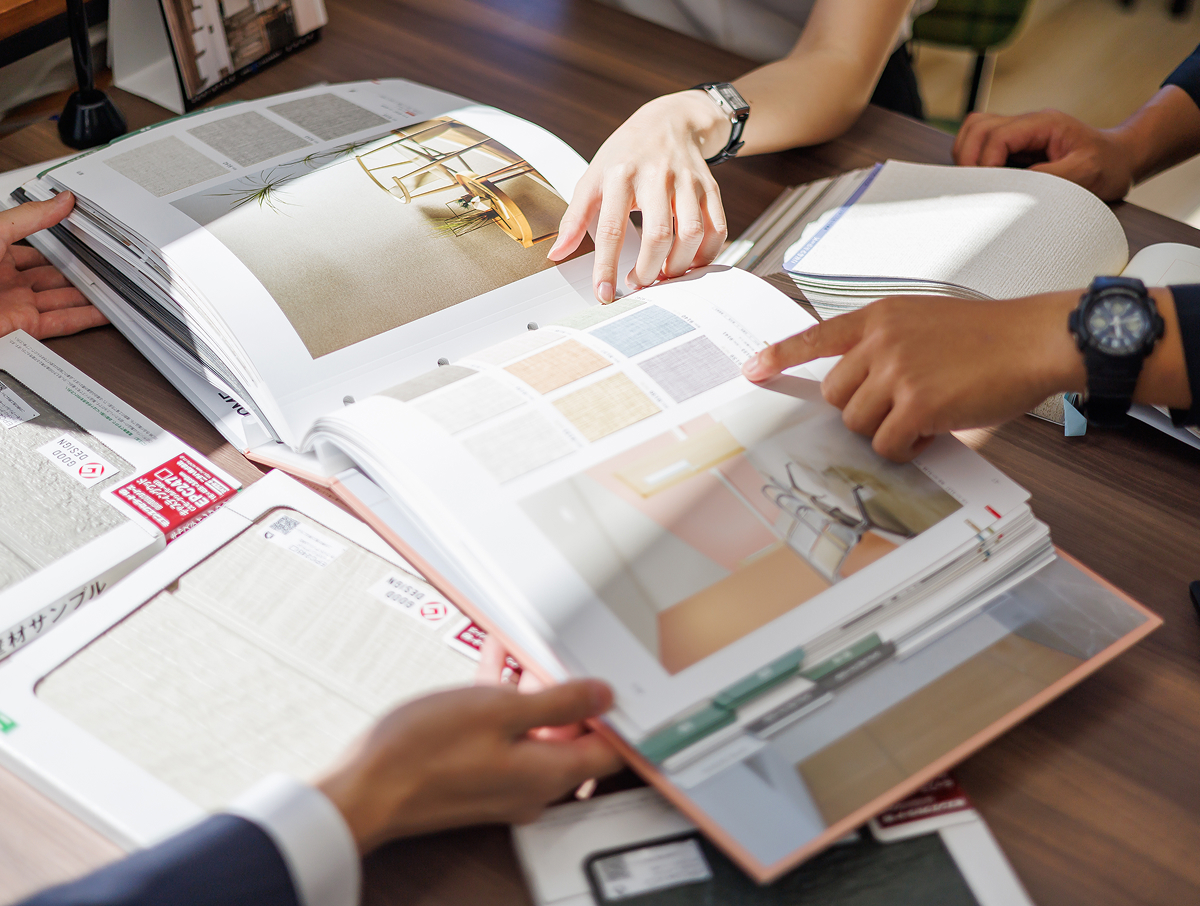 最初のヒアリングから引き渡しまで専属の設計士が一貫して担当します。過去と今、そして将来のお話をお聞きしながら、素材の質感、窓の高さ、光の入り方、生活動線といった細部まで調整し、理想の暮らしの最適解を、経験豊富な設計士がプランとして描きます。