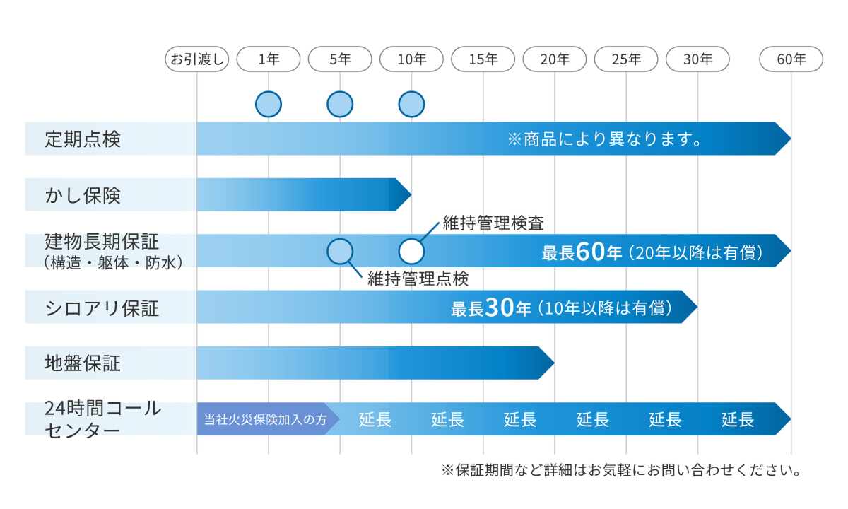 住まいは、建てたあとからが本当のお付き合いです。万が一の不具合や将来のリスクにも備えられるよう、暮らしを守るための手厚い保証制度を整えています。不安を残さず、長く安心して暮らせるからこそ、10年後も50年後も満足できる住まいとなります。