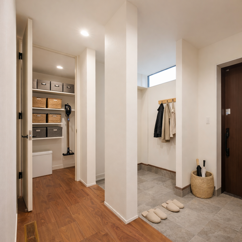暮らしの余裕は、広い玄関から。ゲストを優雅に迎え、家族を機能的に支える土間。