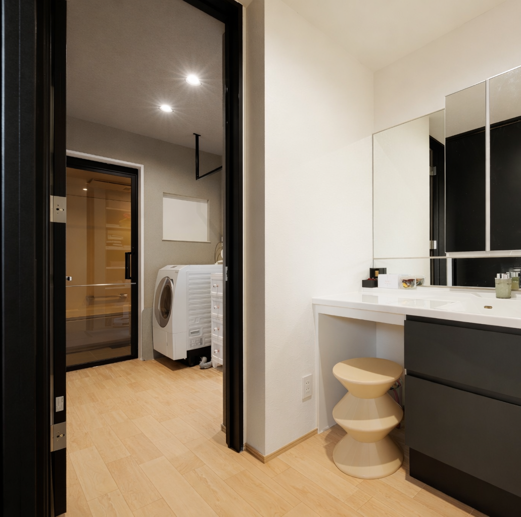誰かがお風呂中でも、気兼ねなくメイクができる。洗面と脱衣を分けた、ストレスフリーな暮らし。