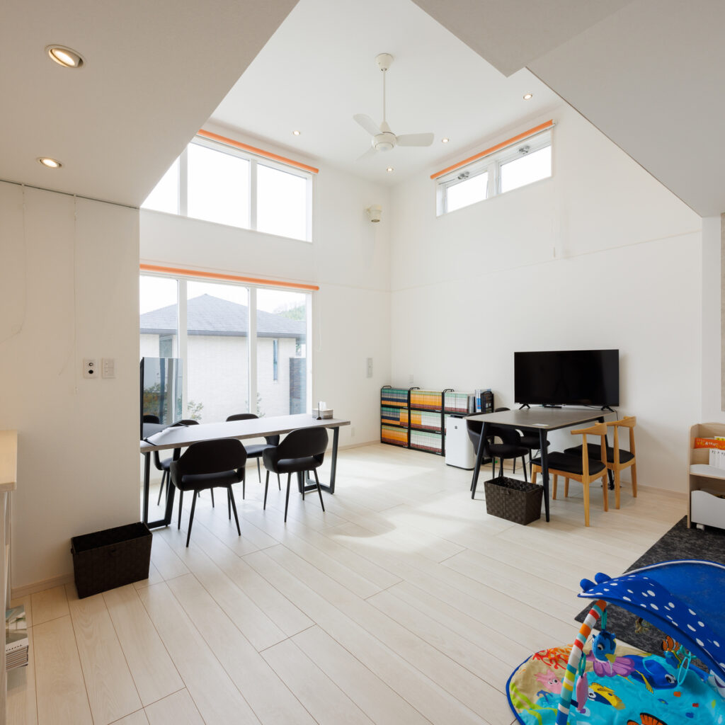 吹き抜けの広々とした空間の打合せスペース。キッズコーナーもあるのでお子様連れでも安心♪