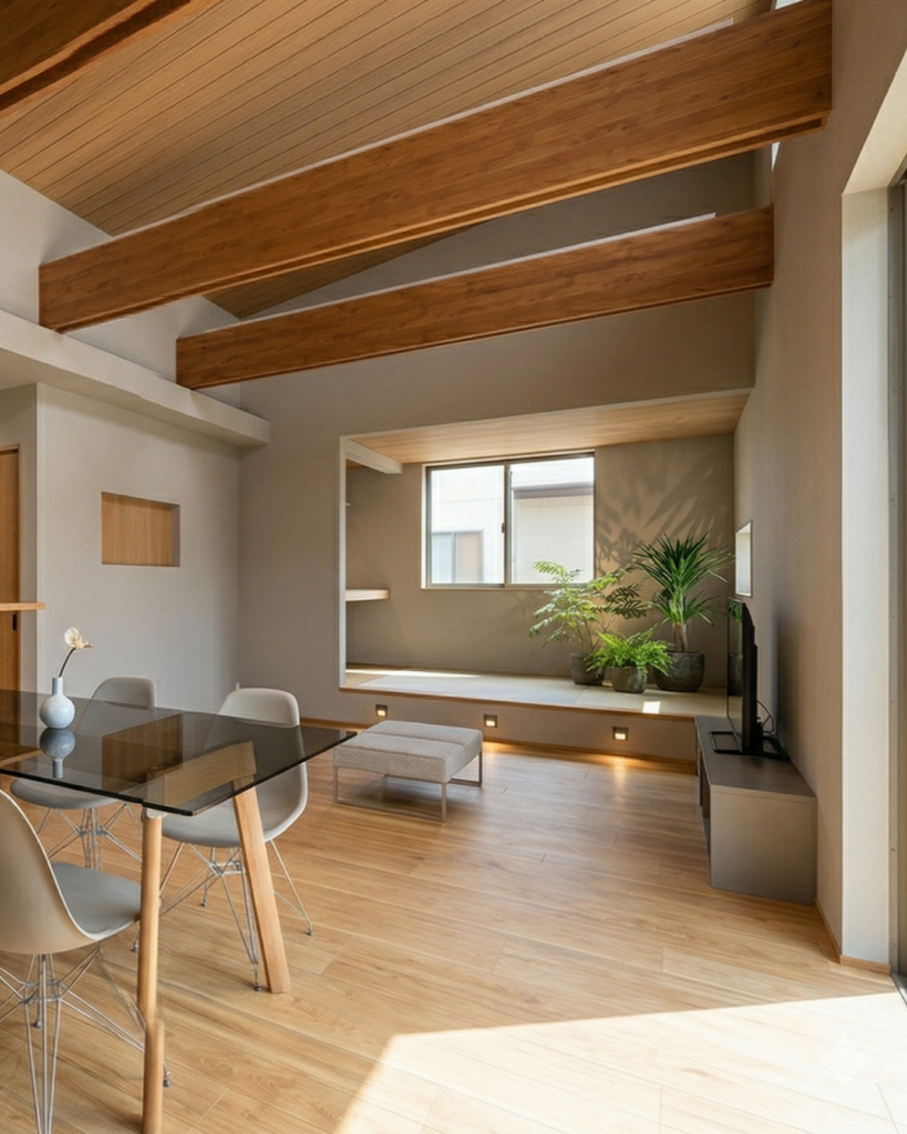 • 平屋とは思えない開放感!勾配天井×化粧梁