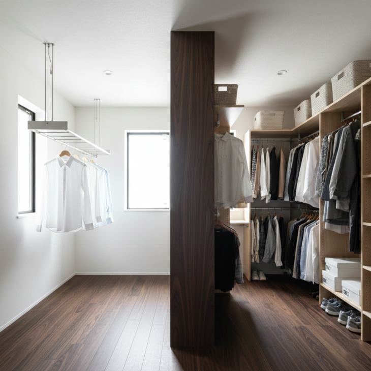 干す⇒畳む⇒収納がこの部屋だけで完結する家事室兼ウォークインクローゼット。