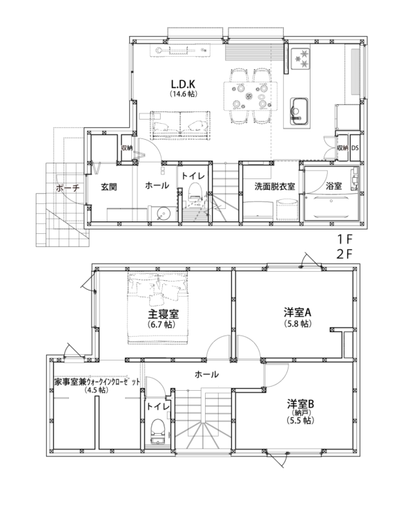 1階はキッチン横に水回りを集約し、お料理と洗濯の並行家事をスムーズに。