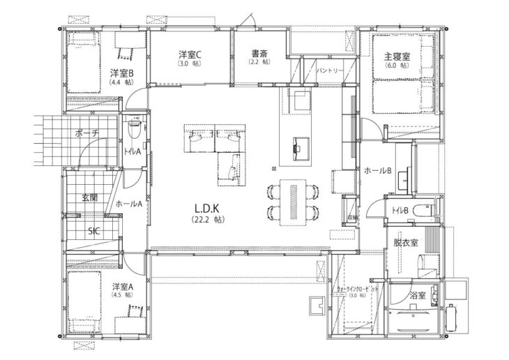 22帖超のLDKを中心に居室が散りばめられ、どの部屋からも光と風を感じられるプラン。家族の気配を感じながら、プライバシーも確保できます。