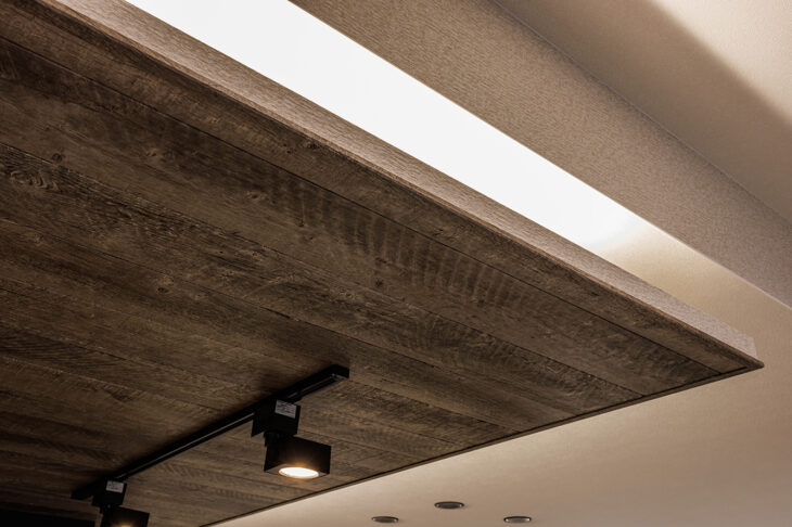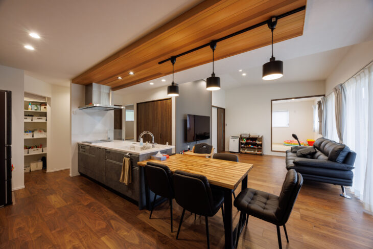 22.9帖のLDKは、人気のある木目調の下がり天井で空間全体にアクセントをつけました。