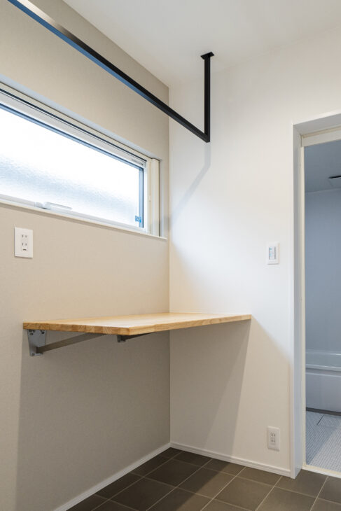 カウンターと室内物干し付きの脱衣室。洗濯物を「干す→畳む→しまう」を1か所で完結し、家事時間を短縮。洗面室と分かれているので、プライバシーにも確保。