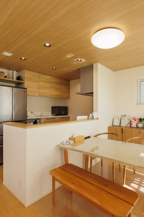 家族の会話が弾む対面式キッチン!自然の温もりを感じる木目天井で、癒しの場に。