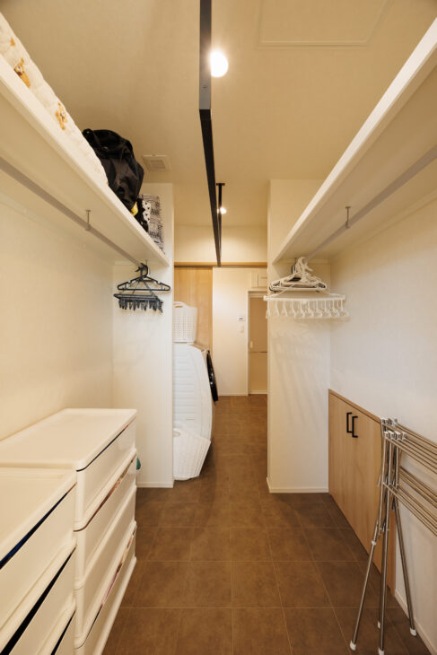 ランドリースペースは乾いた洗濯物をその場でしまうことができる室内干しスペース。お風呂上がりに必要な着替えが全てここで揃います!