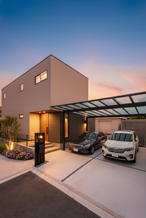 お客様用と家族用の「2WAY動線」と、洗濯がその場で完結する効率的な家事動線が、日々の負担を軽減!デザイン性と快適性を両立した家。