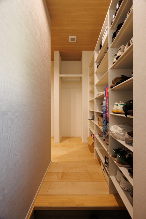 壁一面のシューズインクローゼット!奥にはハンガーパイプが設置されているため、外出時に着るコートやジャケットを掛けることができます。