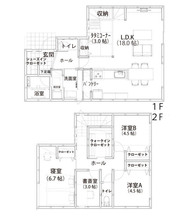 キッチンとダイニングが一直線に並び、配膳・片付けがラク。家事動線がとてもよい間取りです。 - 2階は全室クローゼットを備え、さらに中央にはウォークインクローゼット
