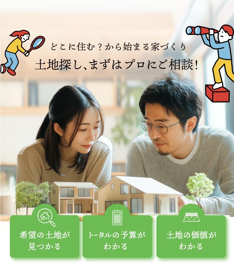 土地に合わせた間取りやデザインをご提案。理想の家づくりのアドバイスを行います。
