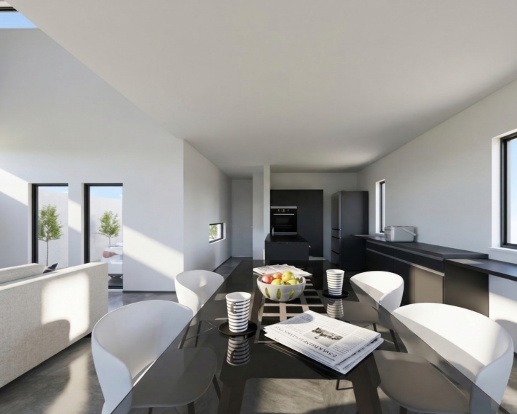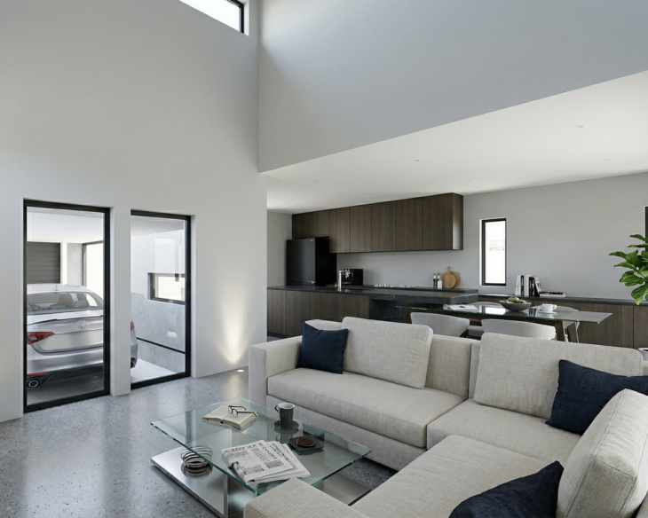 ゆったりとしたリビングのソファでくつろぎながら、ガラス越しに愛車を眺めることができる、車好きにはたまらない贅沢な空間が広がります。
