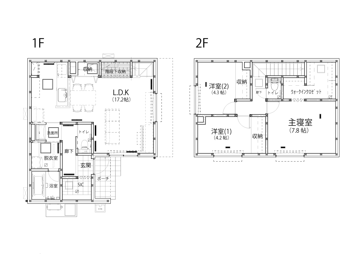 1階に水回りを集約しているため家事効率が良く、2階は各部屋がコンパクトにまとまっていて家族の気配を感じやすい設計。