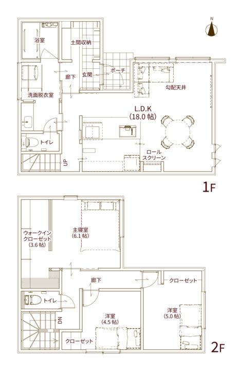 1Fは回遊型のキッチンを中心に東側に勾配天井の広がりのあるLDK、西側には水回りを1箇所に集めて家事がしやすい配置に。2Fはそれぞれにクローゼットを備えたプライベート空間。特に主寝室には大容量のウォークインクローゼットを設けました。