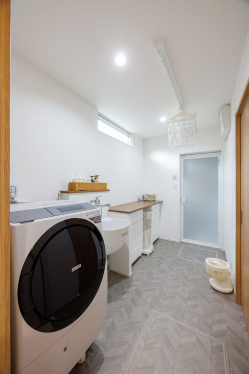 キッチンからすぐアクセスできる水回りスペースは洗濯物干しのついたランドリースペースを兼ねた洗面室。