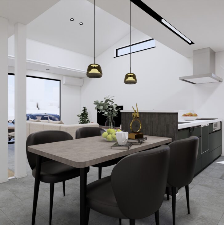 キッチンとダイニングを一直線に配置し、動線もスムーズ。料理をしながら会話も楽しめます。