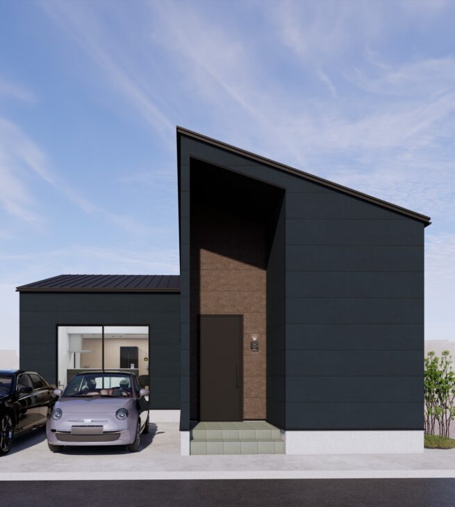 シャープな勾配天井の黒い外観で、スタイリッシュに仕上げました。