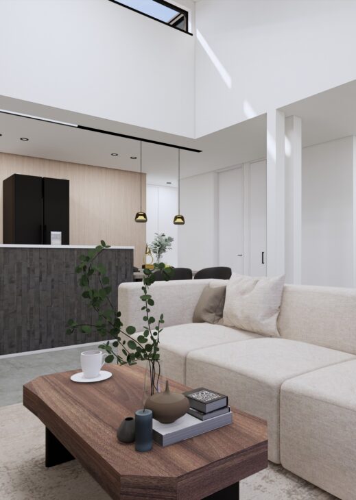 吹き抜けの光が心地よい、開放感と上質さを兼ね備えたリビング。