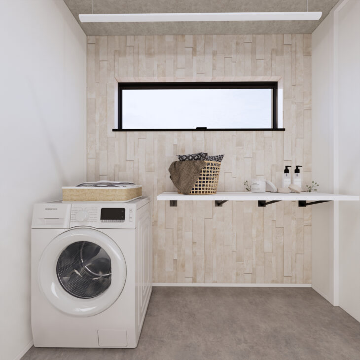 洗濯物を畳んだり、アイロンがけをしたり、家事動線が魅力的なランドリースペース。