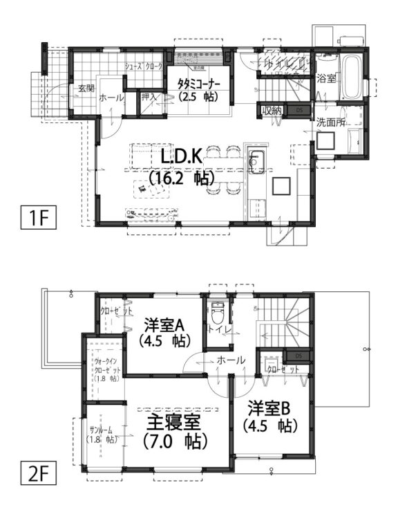 平屋ならではの勾配天井で、16帖でも帖数以上の開放感を実現。