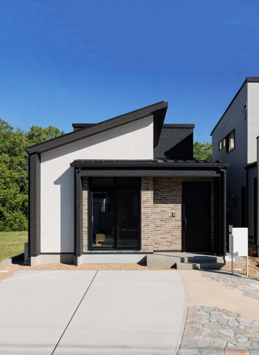 重厚感のあるタイル調の外壁をアクセントに、片流れ屋根がかっこいい外観の平屋です。