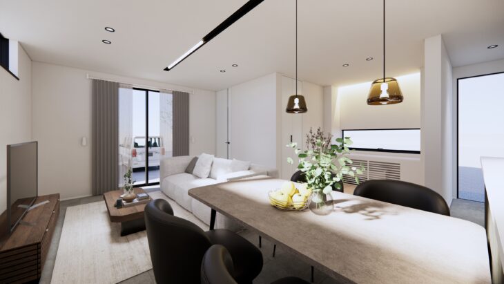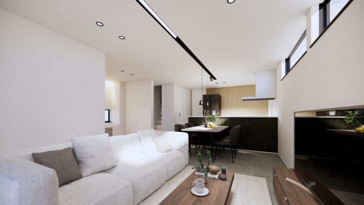 石目調フローリングやモノトーンインテリアが洗練された雰囲気を演出。