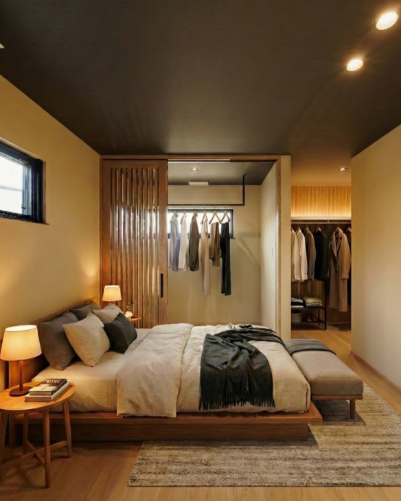 起きてすぐの着替えも、洗濯物を干してしまうのも、移動ゼロでスムーズに完結できます!格子のスライドドアにより、窓からの自然光や風を寝室まで柔らかく届けます。