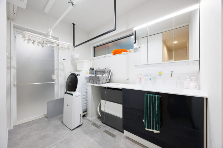 洗面脱衣室にはホスクリーンやハンガーパイプもあり洗濯物をたっぷり干せて、