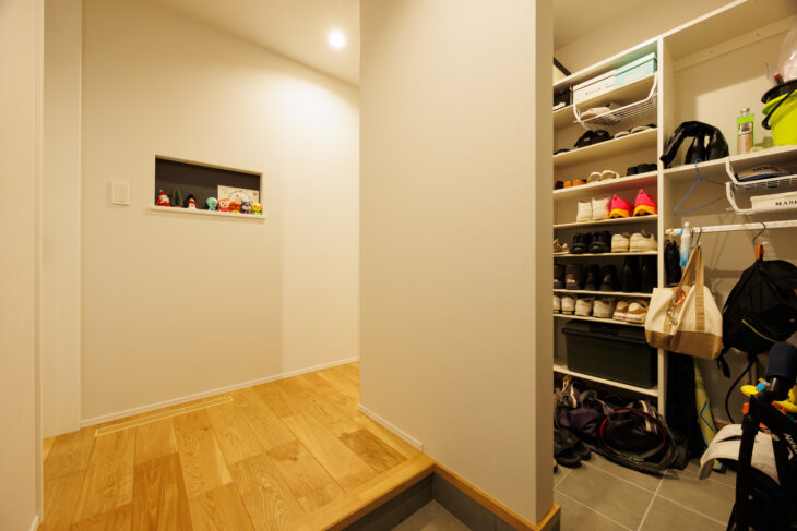 玄関からシューズインクローク、さらにキッチンやパントリーへとつながる動線で、