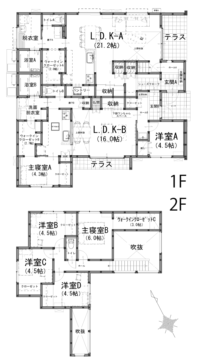 「子世帯」のLDKは21.2帖。吹き抜けや外のテラスに続く大開口窓で開放感抜群。 - 【大容量の収納スペース】
