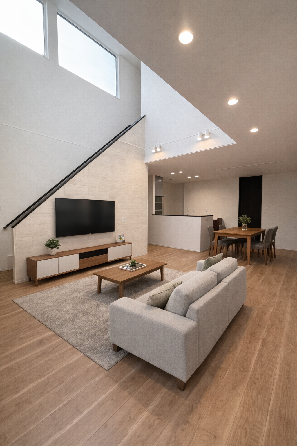 木目×グレージュのナチュラルモダンなLDK。勾配天井で16帖でも帖数以上の開放感を実現。 - 【ロフト+小屋裏収納で、片付け上手に】