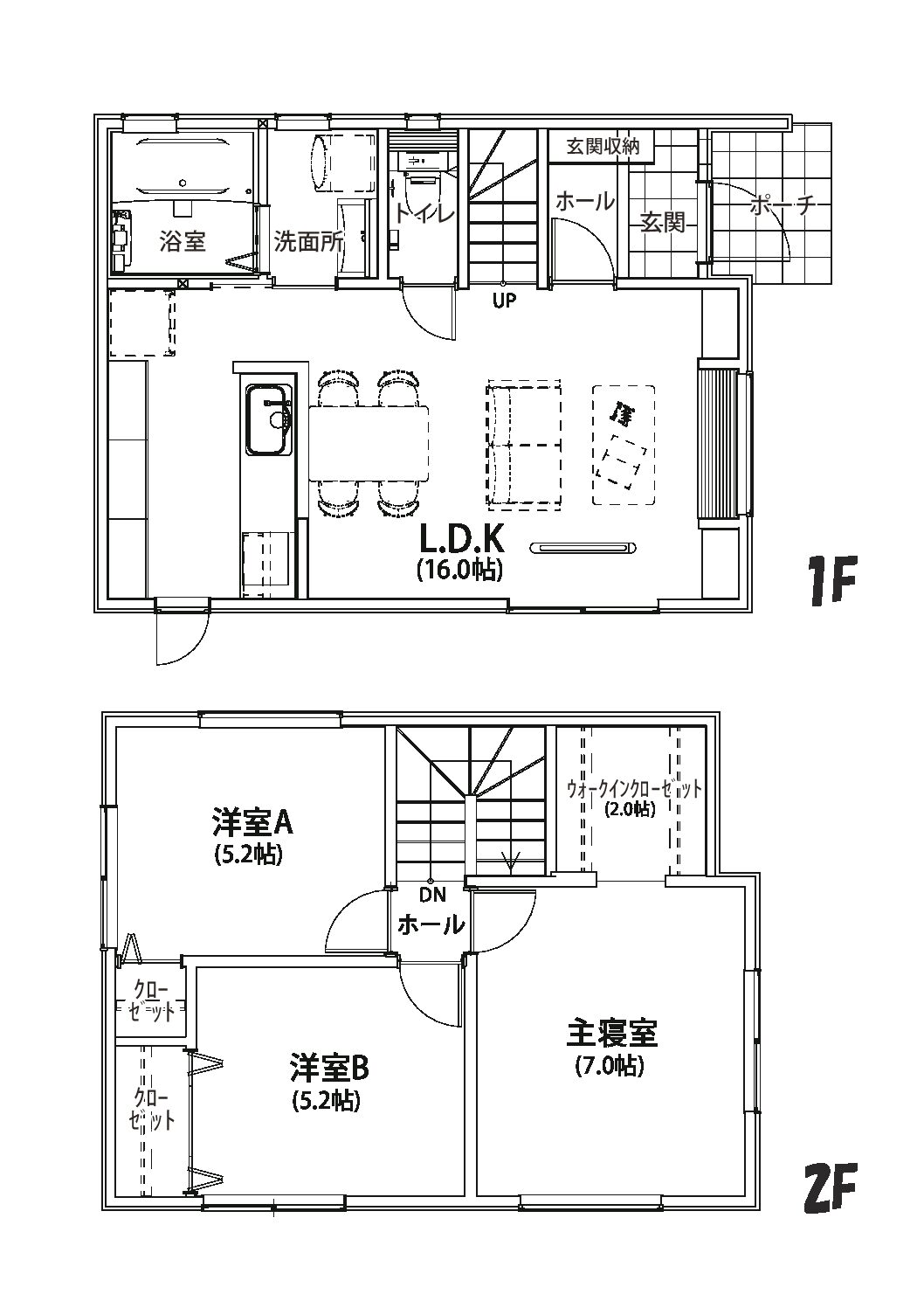 16帖の広々としたLDKを中心に、水回りと階段を集約した効率的な家事動線が魅力です。 玄関横の土間収納や各所のクローゼットなど、生活空間をスッキリ保つ収納の充実ぶりも見逃せません。