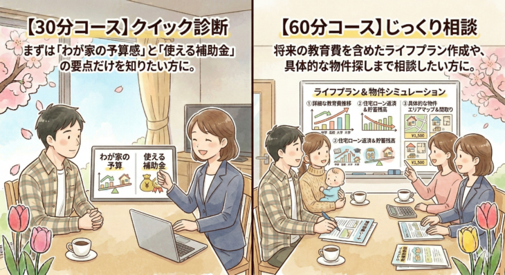 将来の教育費を含めたライフプラン作成や、具体的な物件探しまで相談したい方に。
