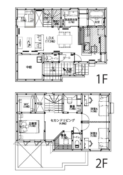 中庭のある17.5帖のLDKを中心に、玄関横にシューズクローク(SC)、階段下収納、ドッグヌック、2階にはセカンドリビング+書斎を備えたホテルライクな家!2日間限定の完成見学会開催!