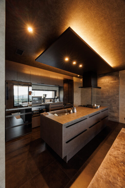 キッチンから中庭への視線が抜ける配置になっており、自然光が入りやすく開放感があります。料理をしながら外の緑を感じられるのが魅力です。
