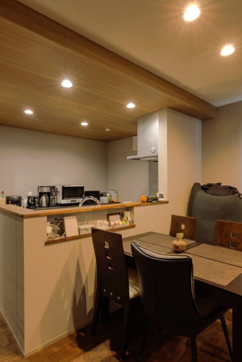 約16帖のLDKには対面式のキッチン。木目天井×グレーのアクセントクロスの組み合わせで空間が引き締まり、ナチュラルモダンな空間に。